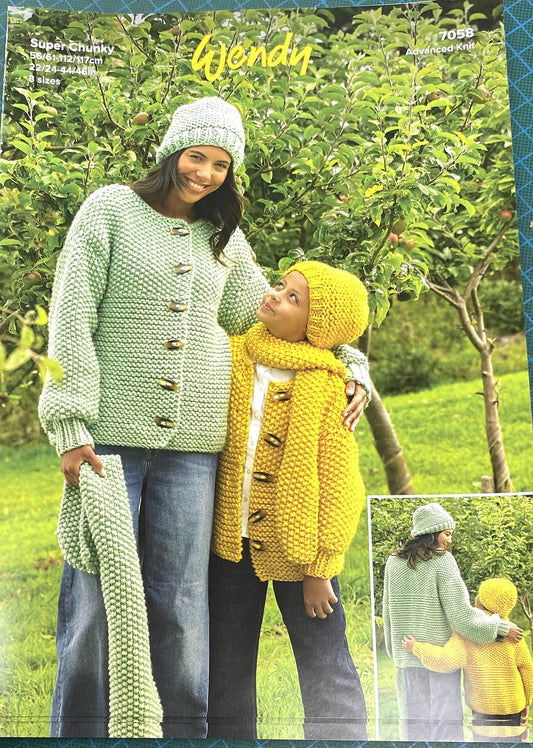 Wendy 7058 Knitting Pattern Super Chunky Jacket, Hat and Scarf