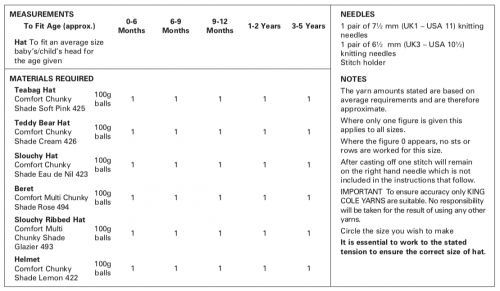 King Cole Hats up tp 5 yrs Chunky 3391
