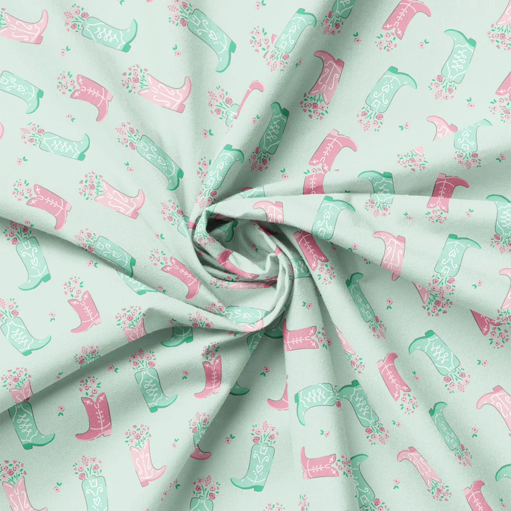 Rodeo Rose Collection-Boots in Bloom-Light Aqua Saddle up with the sweetest little cowgirl quilting cotton fabric collection ever with Camelot Design Studio's very own 'Rodeo Rose'. Featuring a soft colour palette and all the trappings of trendy Western-inspired imagery like cactus, cowboy hats and boots, horseshoes, florals,