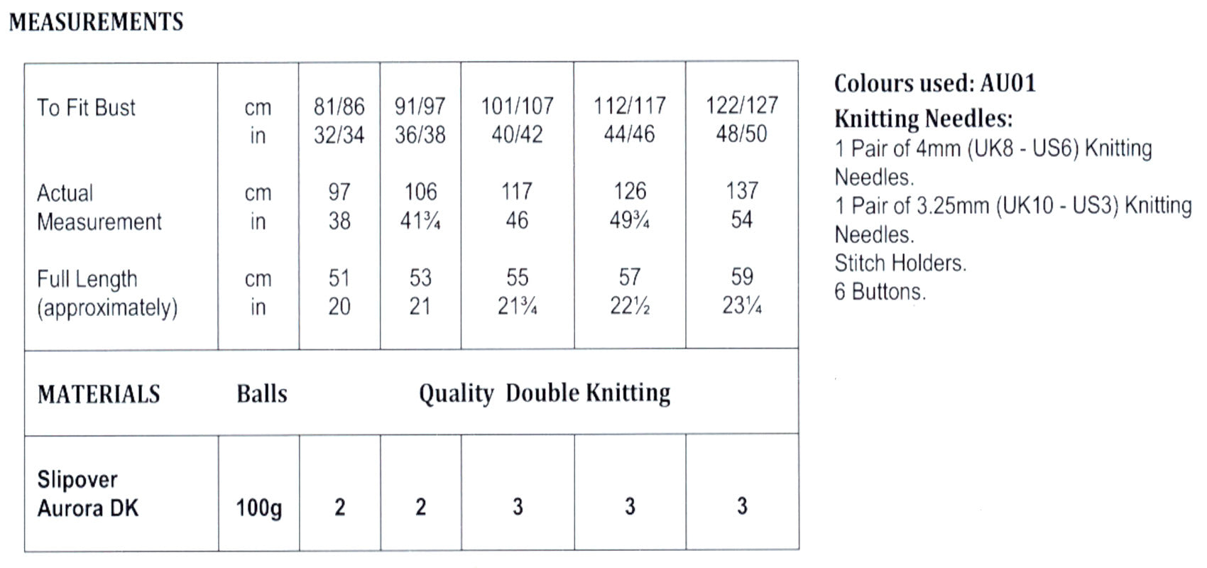 This intermediate knit pattern gives you measurements to create the garment to fit a 32/34" - 48/50" (81/86cm - 122/127cm) bust approximately.