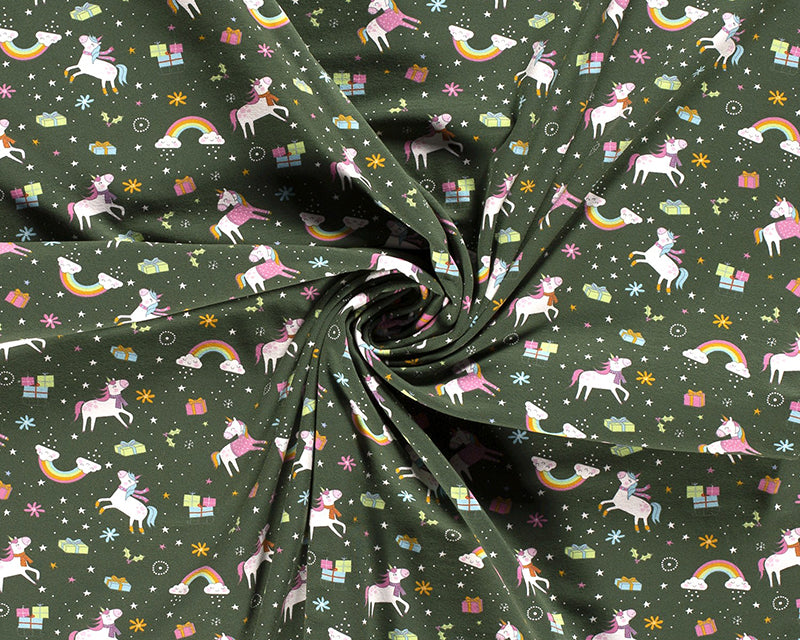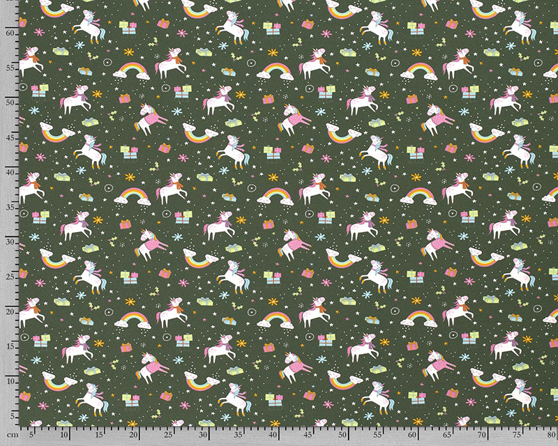 This fabric features a fun, Christmas, unicorn design that also features rainbows, presents, stars and snowflakes set against either an olive background.