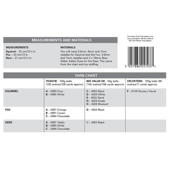King Cole 9212 Woodland Wildlife - Knitting Pattern Fox, Squirrel and Deer - Toastie