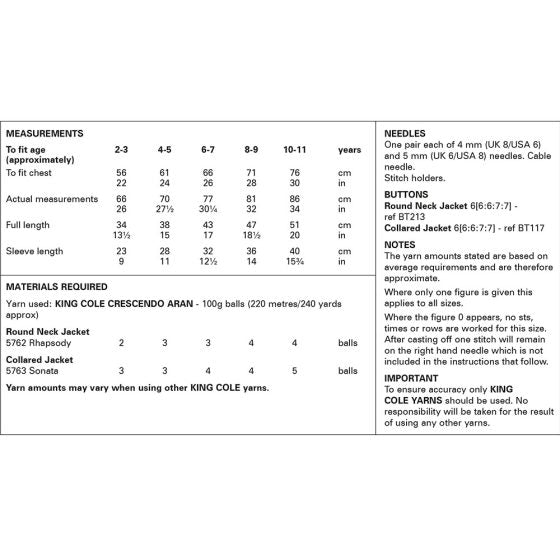 King Cole Knitting Pattern 6223 Childs Jacket - Aran