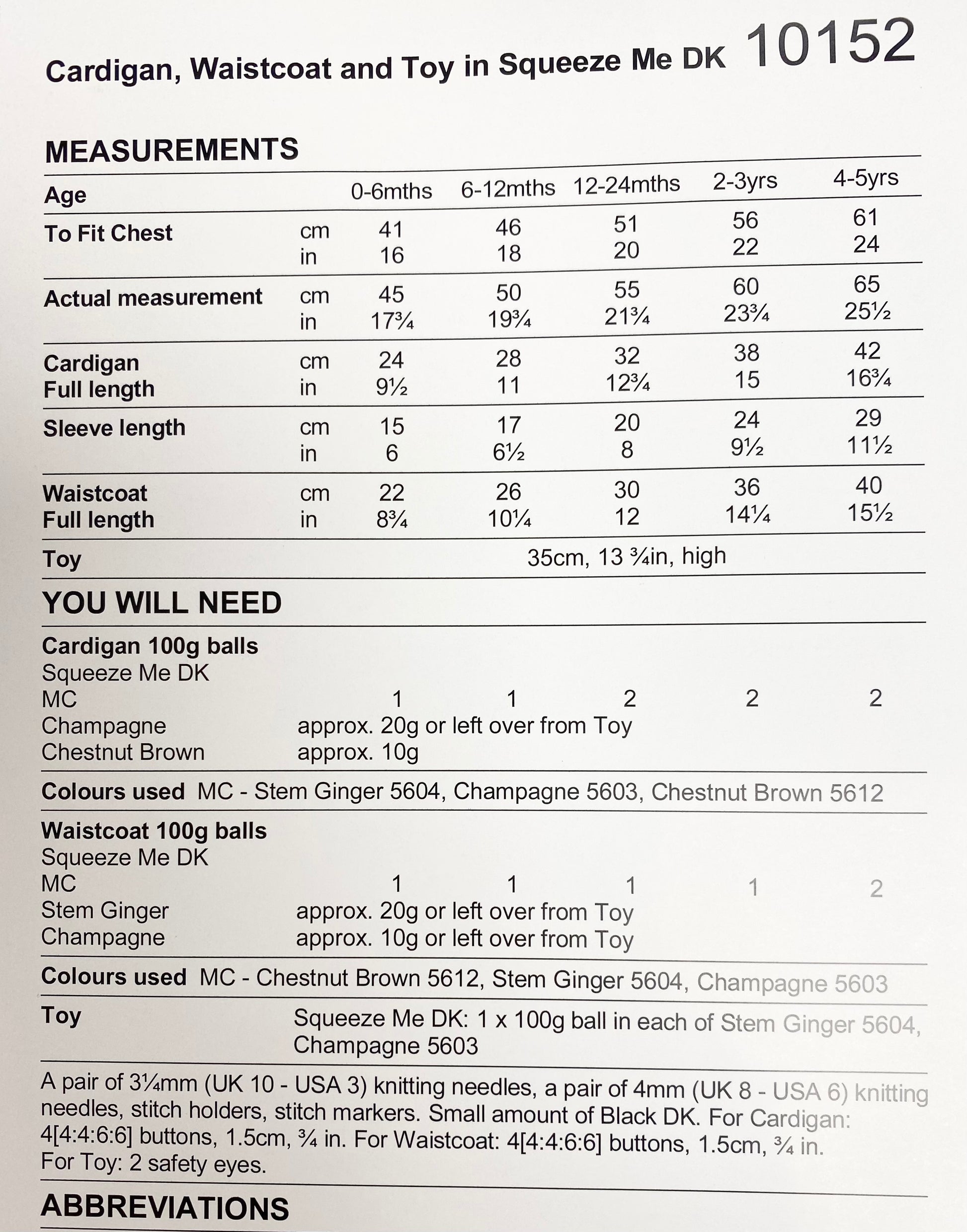 You will need: A pair of 3¼mm (UK 10 - USA 3) knitting needles, a pair of 4mm (UK 8 - USA 6) knitting needles, stitch holders, stitch markers. Small amount of Black DK. For Cardigan: 4[4:4:6:6] buttons, 1.5cm, ¾ in. For Waistcoat: 4[4:4:6:6] buttons, 1.5cm, ¾ in. For Toy: 2 safety eyes.