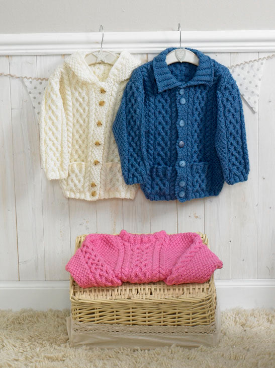 Three great Aran knits for those cooler days. We have a sweater and two jackets. One of the cardigans has a neat little collar and the other has a hood, everyone's favourite and so useful. Pockets on the two cardigans give that added detail.