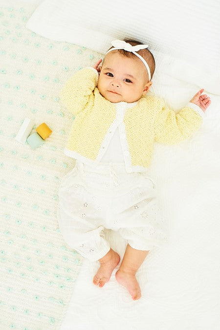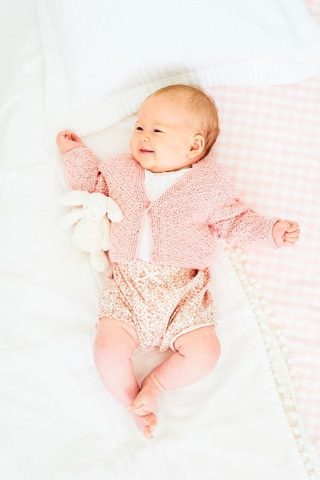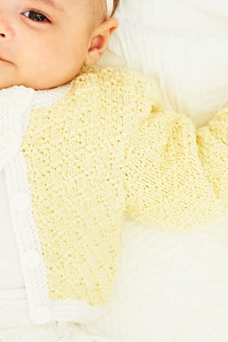These gorgeous little easy knit cardigans have a diamond texture created just by the clever use of knit and purl stitches. The round neck cardigan has been designed with a contrast trim. For sizes from new born to three years.