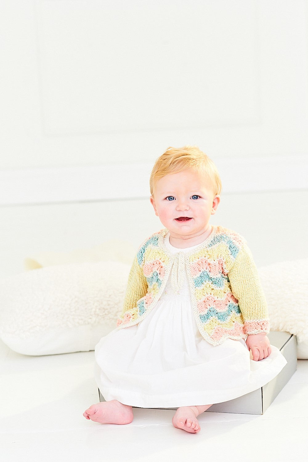This pretty fan and feather lace pattern is the perfect design to show off the pretty shades of Baby Sparkle. You have the option of two cardigan, both with delicate tie necklines, and a beautiful blanket which uses every shaded in the range to get a lovely rainbow effect.