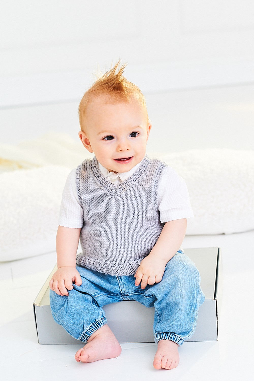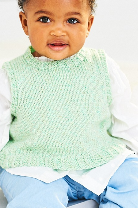 These easy knit tank tops are a great way of making a quick garment that looks cute and smart on little ones. Perfect for layering, there is the option of V neck or round neck.
