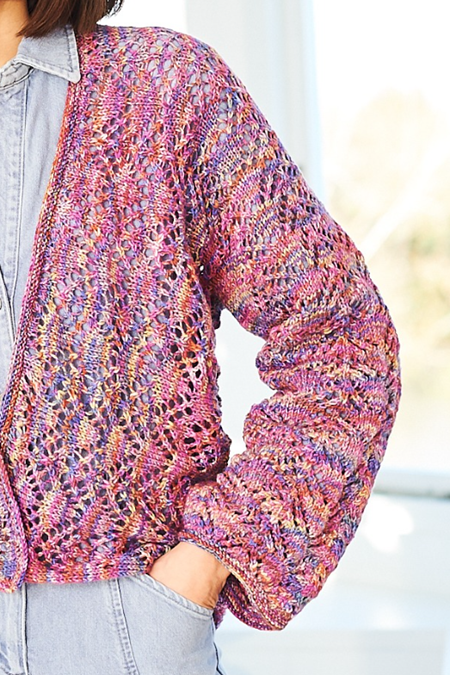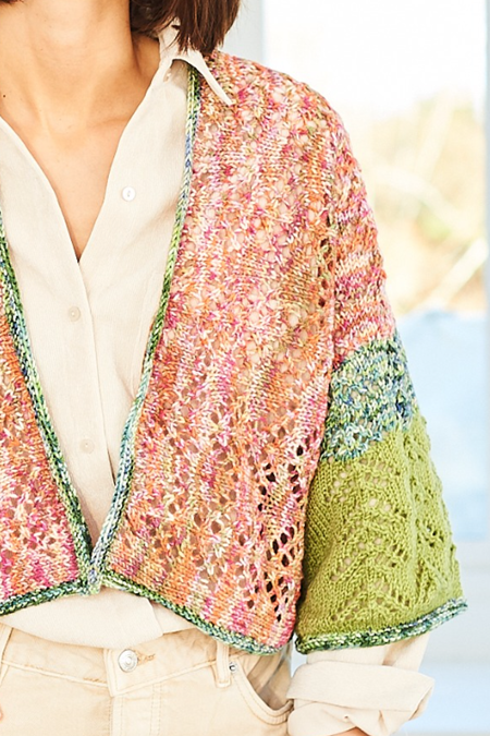 These lace kimono-style cardigans are the star of the show. We have a long and short version, the short using two shades of Batik Elements Swirl and one shade of Life DK for a fabulous colour combination. Both cardigans are knitted lengthways from cuff to cuff for a different way of working.