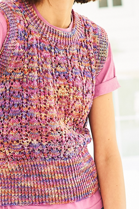 Here we have an elegant lace pattern used over this cardigan and tank top. The lace is used on the sleeves for the cardigan and the body of the top. The deep welts on the tank gives extra shape and a fitted feel. The cardigan is fitted with one button to finish it off.