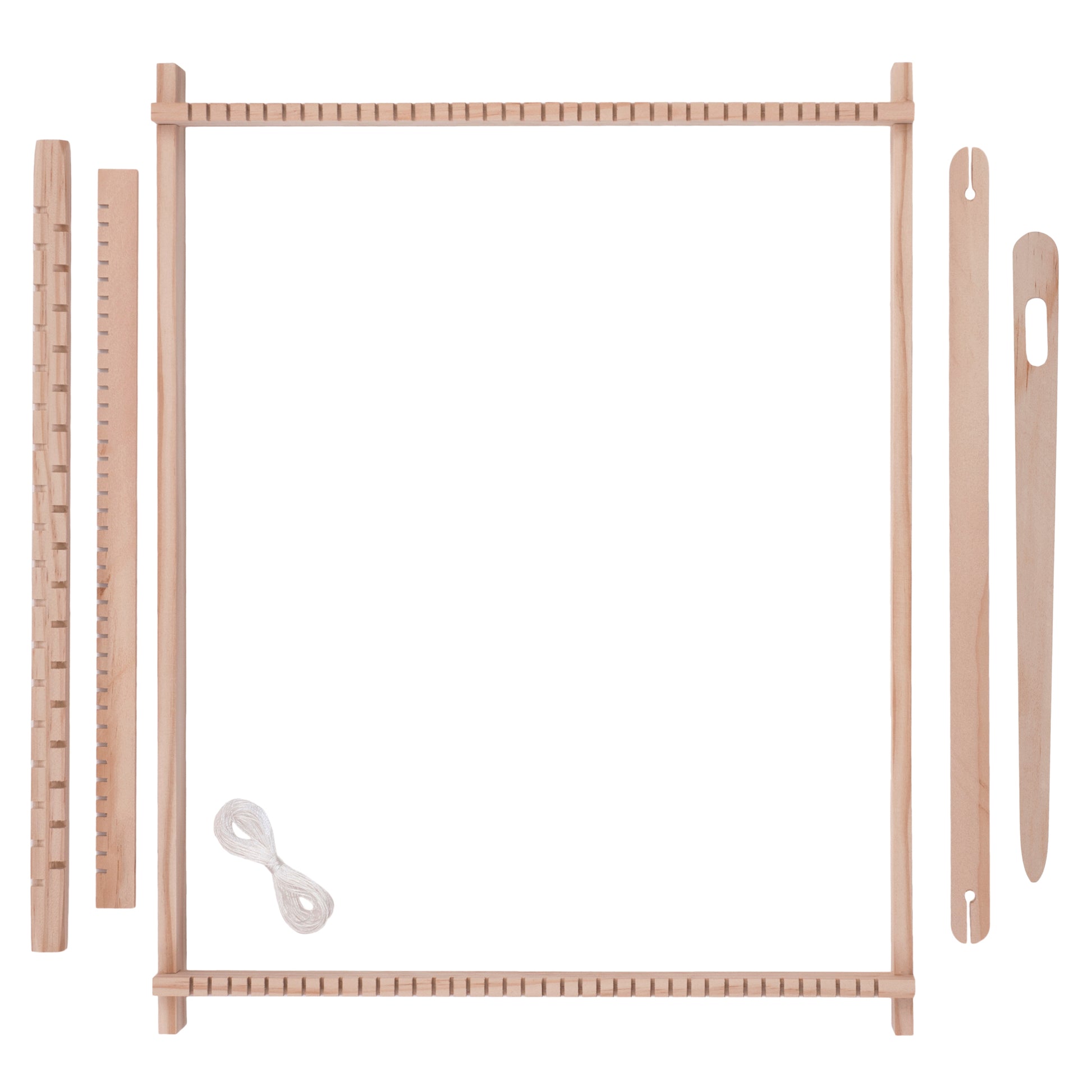 Made from pine and plywood. Kit contains: loom, needle, shuttle, warp separator and warp yarn.